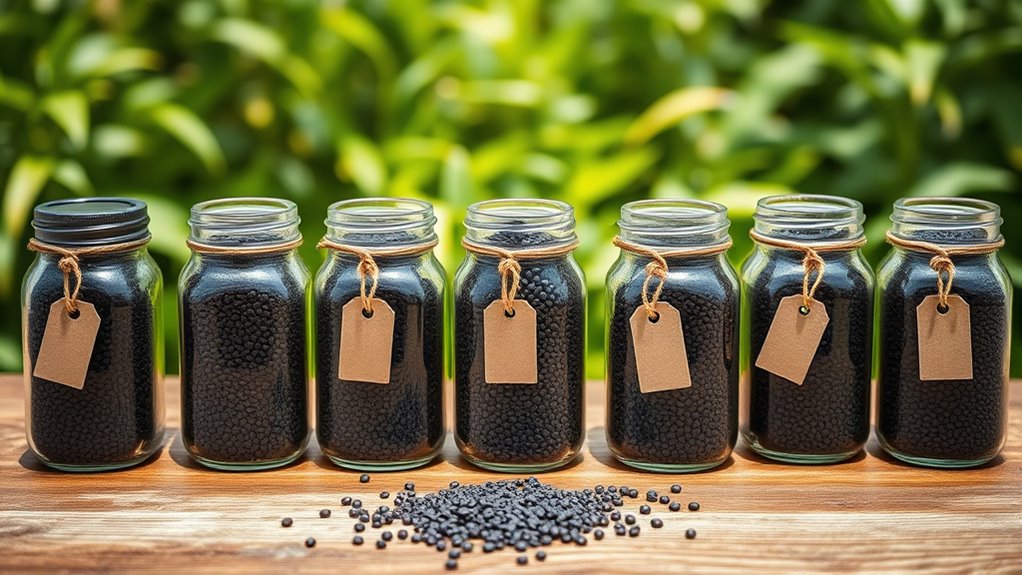 Ensuring my chia seeds stay fresh requires paying close attention to packaging and storage. I always look for resealable bags or airtight containers that block out air and moisture, which can cause spoilage. Storing seeds in a cool, dark, and dry place *considerably* extends their shelf life, preventing rancidity. I prefer vacuum-sealed packaging when available, as it preserves nutrients and flavor over time. I also regularly check the packaging for signs of moisture or pests, ensuring the seeds remain safe and fresh. Keeping chia seeds away from direct sunlight and high humidity is essential, as exposure accelerates oxidation and spoilage. Proper storage not only maintains freshness but also guarantees I get the most nutritional value from my bulk purchase.