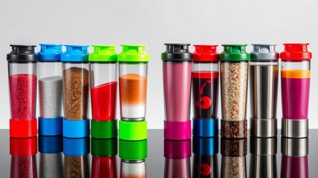 You might worry about leaks during vigorous shaking, but I’ve found Blender Bottles do a great job here. Their secure screw-on lid and Leak-Proof BlenderBall ensure no spills, even when I shake hard. The tight seal and design make me confident my drink stays inside, no matter how intense my workout gets. So yes, these bottles are reliable and won’t spill during your most vigorous shakes.