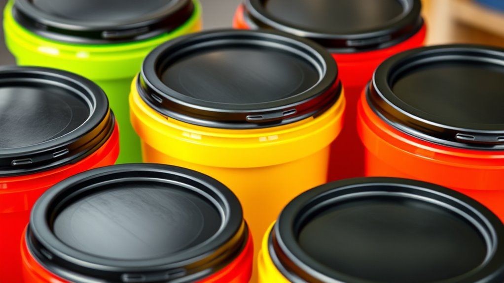 Color and identification features play a essential role in organizing your stored items efficiently. By choosing different colors for Gamma Seal lids, I can easily distinguish between contents at a glance, saving time and reducing errors. Color coding helps prevent cross-contamination, especially when separating food, pet supplies, or household materials. With options like red, white, blue, yellow, green, and black, I have flexibility to categorize items logically. Using consistent colors for specific materials improves both household and industrial storage systems. Additionally, color-coded lids make it simple to locate items quickly and manage inventory, especially when multiple buckets hold similar contents. Overall, selecting the right color enhances organization, efficiency, and peace of mind in keeping everything well-sorted and accessible.