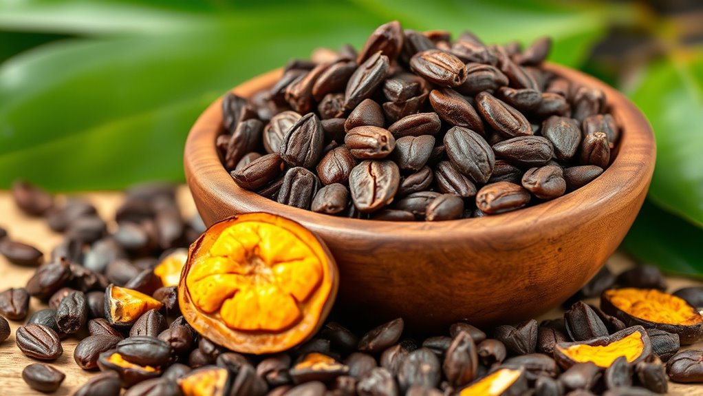 Processing and roasting methods play a essential role in determining the flavor, nutritional quality, and rawness of organic cacao nibs. Minimal processing, like low-temperature drying and gentle crushing, helps preserve nutrients and antioxidants, keeping the nibs closer to their natural state. The roasting process varies from raw (unroasted) to lightly roasted; raw cacao nibs skip roasting altogether, maintaining maximum nutritional integrity. Lightly roasted nibs develop subtle flavor nuances without significant nutrient loss, while heavily roasted ones have a more pronounced chocolate flavor but may lose some antioxidants and phytochemicals. The degree and method of roasting influence the final taste profile, from mild and nutty to deep, roasted chocolate notes. Choosing products that clearly state their processing methods helps you find cacao nibs aligned with your flavor preferences and nutritional priorities.