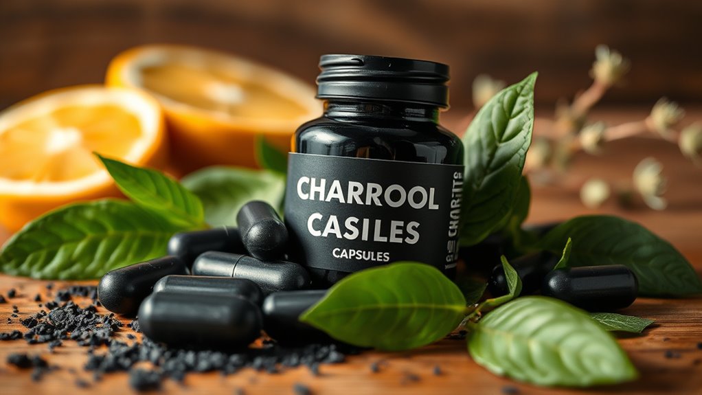 Adding additional detox ingredients to charcoal capsules can markedly boost their effectiveness by supporting various bodily functions. For instance, ingredients like activated charcoal, Zeolite, Bentonite clay, and Chlorella help bind and eliminate toxins more efficiently. Botanicals such as Milk Thistle, Dandelion Root, and Turmeric promote liver health and aid natural cleansing processes. Including prebiotics and probiotics can improve gut health and digestion during detox, making the process smoother. Compounds like N-Acetyl Cysteine (NAC) boost glutathione production, enhancing cellular detoxification and antioxidant defenses. To maximize absorption, some formulas add bioavailability enhancers like Piperine. Considering these ingredients guarantees a more thorough and effective detox, supporting your body’s natural ability to eliminate toxins and maintain overall health.