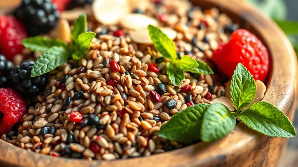 A well-balanced chia hemp mix offers the right blend of nutrients to support your health goals. It should contain adequate omega-3 and omega-6 fatty acids, vital for heart and brain health, with a balanced ratio to maximize benefits. The mix needs a suitable fiber content—around 3-7 grams per serving—to aid digestion and help you feel full longer. Plant-based protein, ideally 4-8 grams per serving, supports muscle maintenance and overall wellness. Including a variety of seeds ensures a broad spectrum of essential minerals, antioxidants, and phytochemicals that boost immunity and energy. Most importantly, the nutritional profile should align with your specific dietary aims, whether weight management, heart health, or energy enhancement, providing a harmonious balance of macronutrients and micronutrients.
