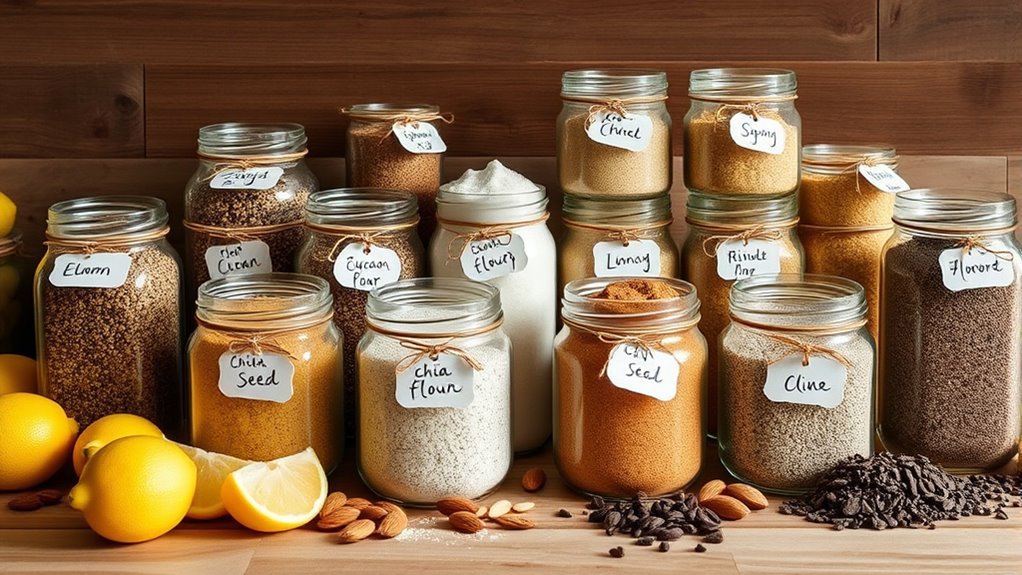 To keep your chia seed flour fresh, I recommend storing it in an airtight container in a cool, dark place like the pantry. Avoid exposure to sunlight and moisture, which can cause spoilage. I also suggest transferring it to a resealable bag once opened for added protection. If you buy in bulk, consider refrigerating or freezing a portion to extend its shelf life and preserve its nutritional quality.