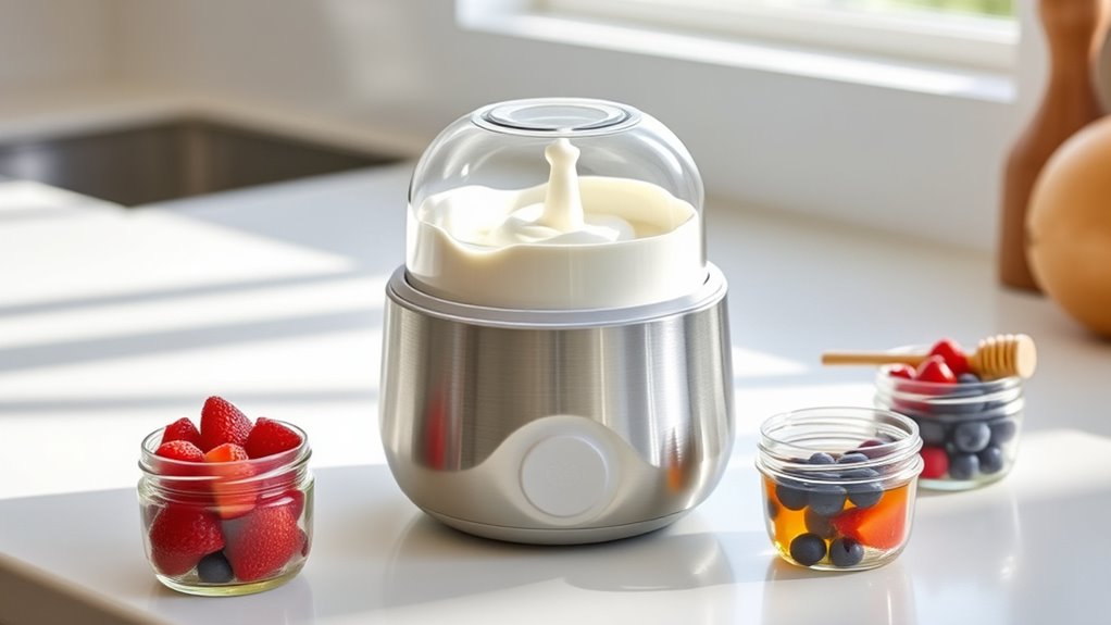 An automatic yogurt maker with a stainless steel container is ideal for home cooks who want consistent, high-quality results with minimal effort. Its compact design and constant temperature control ensure ideal fermentation for delicious yogurt every time. With a 1-quart capacity, it’s perfect for small families or individuals. You can customize your yogurt by choosing different types, adjusting fermentation time, or adding ingredients like fruits and nuts. The stainless steel container is durable, easy to clean, and maintains temperature stability. Overall, it simplifies the yogurt-making process, letting you enjoy fresh, homemade yogurt without the hassle or mess.