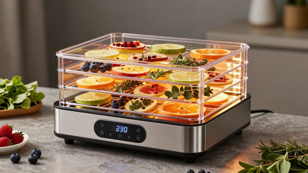 In short, a countertop dehydrator transforms your approach to harvest storage. It empowers you to take control of fruit preservation, using dehydration techniques that retain flavor, nutrients, and quality. With this simple device, you turn fresh harvests into long-lasting, tasty treats while minimizing waste and maximizing convenience. Whether you’re drying apples, berries, or peaches, these dehydrators make the process straightforward and efficient, ensuring you always have a supply of healthy, homemade snacks ready whenever you need them.