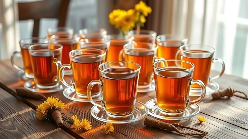 Adding herbal blends to dandelion root tea can considerably enhance its flavor and health benefits, especially if you find the pure root too bitter. Blending herbs like peppermint, chamomile, or lemon balm not only makes the tea more palatable but also boosts its digestive support and provides additional wellness perks. Some blends target specific goals, such as liver detox or immune support, by combining dandelion with herbs like fennel or coriander that soothe digestion and reduce bloating. When choosing herbal blends, consider how the herbs work together—look for synergy and potency aligned with your health goals. A well-crafted blend can transform your tea experience, offering a tasty way to maximize the benefits of dandelion root while catering to your personal preferences.