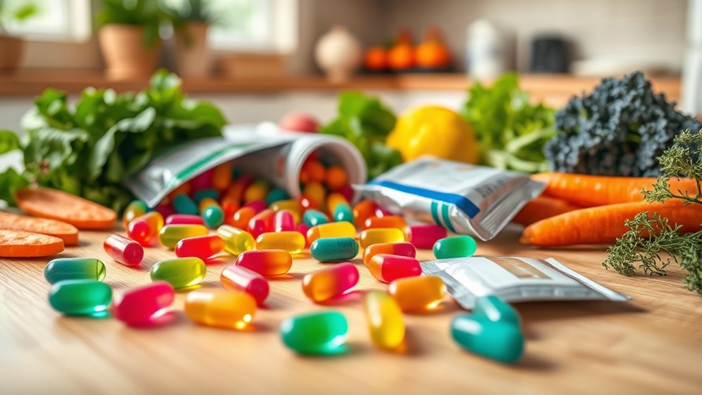 When choosing probiotic supplements, I consider the strain diversity and CFU count to guarantee effective gut support. I look for products specifically formulated for seniors, which often include strains that aid digestion and boost immunity. It’s also important to check for quality certifications, avoid unnecessary fillers, and consult my healthcare provider to match the supplement to my specific health needs. This way, I can confidently support my gut health.