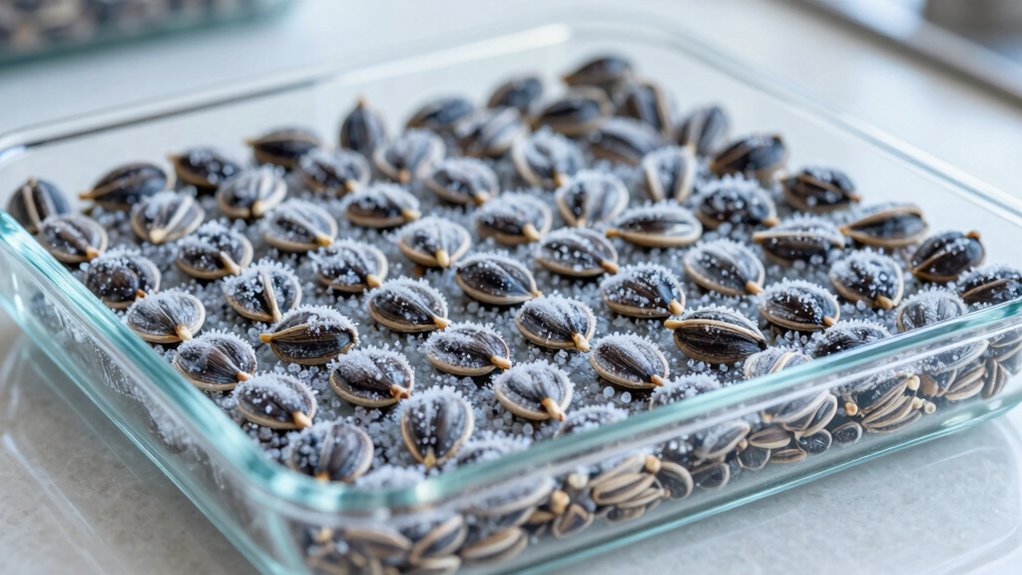 When it comes to drying techniques, many people underestimate the importance of a proper pre-drying phase. Before freeze drying, seeds should be thoroughly dried using traditional methods like air drying or low-temperature oven drying. This step reduces moisture content, making the freeze drying process more effective. If you skip this, you risk trapping residual moisture inside the seeds, which can compromise seed viability after thawing. Also, not all seeds respond equally to freeze drying. Some seeds, especially those from plants with hard seed coats, may require specific handling to guarantee they survive the process intact. You’ll want to experiment with small batches first to find the right approach for each seed type. Additionally, understanding seed dormancy, which can affect germination success, is crucial when planning your seed preservation strategy. Moreover, being aware of the seed’s moisture content before processing helps optimize the drying process and improve overall viability.
