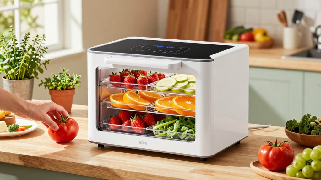 If you love gardening and want to preserve your harvest for the long term, a home freeze dryer can be a game-changer. It offers a modern approach to preservation techniques, allowing you to keep fruits, vegetables, and herbs fresh for months or even years without sacrificing flavor or nutrients. Unlike traditional methods like canning or dehydrating, freeze drying removes moisture through sublimation, which maintains the integrity of delicate textures and vibrant colors. This process results in lightweight, shelf-stable products that are easy to store and rehydrate when needed. When shopping for a home freeze dryer, consider models that emphasize energy efficiency, as this can considerably reduce your operating costs over time. Energy-efficient units consume less power while maintaining consistent performance, making them more sustainable and economical for everyday use. Look for features like adjustable cycle times and smart controls, which help optimize energy consumption based on the quantity and type of produce you’re drying.