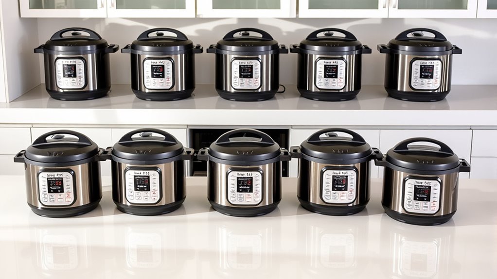 Choosing the right size for your Instant Pot is just as important as selecting its features. A 6-quart model is perfect for small families or meal prepping, serving 3 to 6 people comfortably. It offers enough space to cook large batches of soups, stews, and roasts quickly, saving time and effort. However, it’s essential to guarantee it fits well on your countertop and storage area. While versatile for most recipes, it might be too small for larger groups or frequent batch cooking. The 6-quart capacity also allows you to prepare multiple dishes at once using extra accessories like additional inner pots. Overall, this size strikes a great balance between capacity and convenience, making your cooking process more efficient without taking up too much space.