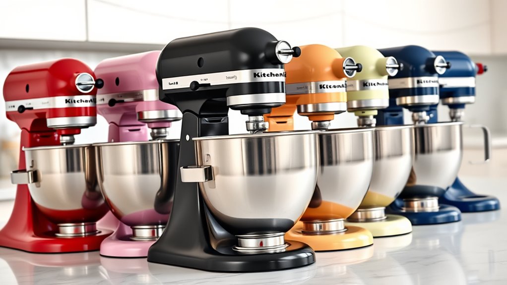In 2025, choosing the right KitchenAid stand mixer color depends on your personal style and kitchen vibe. Bold shades like aqua or red add personality, while neutral tones like black or white keep things classic. Consider your space, current trends, and how durable the finish is. I’ll guide you through the top five colors and tips to match your decor—stick around to find the perfect hue for your kitchen.