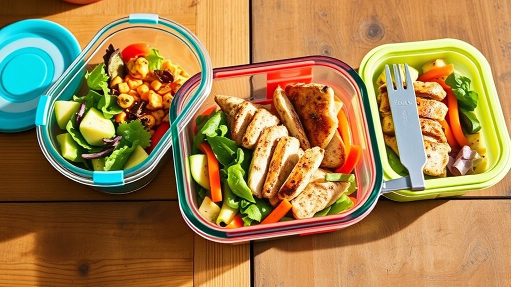 Think of lids as the gatekeepers of your meal’s freshness. The best lids to prevent leaks are silicone-sealed, snap-on types made specifically for glass containers. I swear by those with locking clips or tabs—they grip tight and keep spills at bay. Always check for a secure seal before tossing your container in your bag. With the right lid, you’ll keep your food fresh and mess-free all day long.