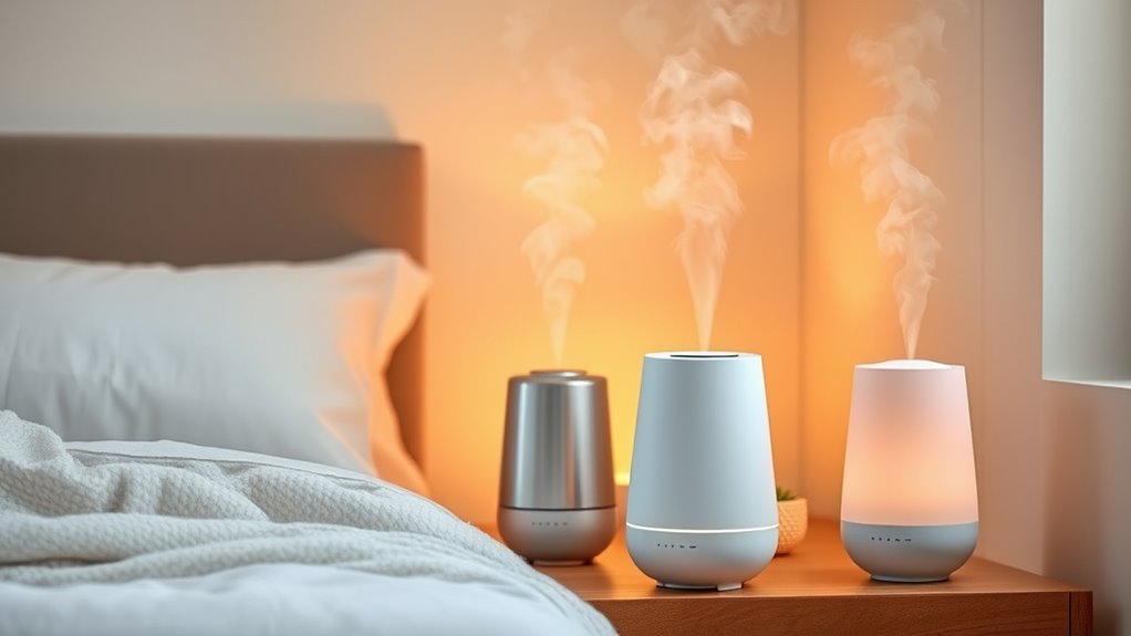 When selecting a humidifier for my bedroom, I consider additional features that can boost comfort and convenience. Aromatherapy diffusers and mood lighting help create a relaxing atmosphere, making it easier to unwind and sleep soundly. Many models have adjustable mist settings and 360-degree nozzles, allowing me to customize humidity levels and guarantee even distribution throughout the room. Built-in night lights with adjustable colors add a soothing touch, enhancing the ambiance. I also look for top-fill designs or filterless operation, which make cleaning and maintenance simpler. Features like auto shut-off and quiet operation are essential for safety and a peaceful sleep environment. These added features not only improve functionality but also transform my bedroom into a cozy, calming retreat.