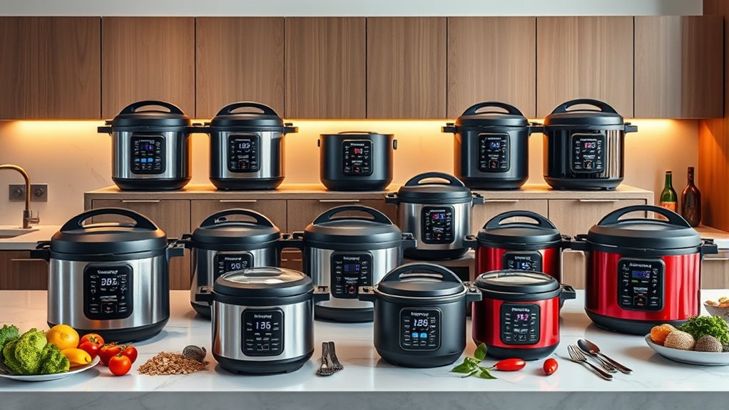 If you’re looking to upgrade your kitchen, I’d suggest exploring the top multifunction pressure cookers coming in 2025. These versatile devices combine pressure cooking, slow cooking, air frying, and more, saving space and time. Popular models like the Instant Pot Duo Crisp, Chef iQ, and Fullwill offer smart features, safety, and huge capacity options. Curious about which one fits your needs? Stick around, because I’ll share all the details to help you make the best choice.