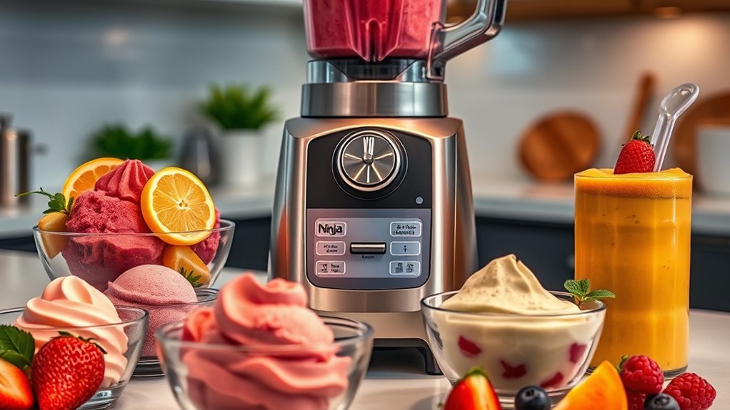 Ingredient versatility is a key factor to contemplate when choosing Ninja Creami Deluxe recipes because it determines how many different types of frozen treats you can create. With a wide range of ingredients like dairy, fruits, nuts, and plant-based options, you can tailor recipes to various dietary needs and preferences. Using diverse ingredients also enhances flavor profiles and textures, making your frozen treats more interesting and customizable. The Ninja Creami’s compatibility with different bases means you can easily switch between creamy ice creams, light sorbets, or dairy-free options. Plus, ingredient flexibility encourages experimentation—adding mix-ins like chocolate chunks or fruit swirls creates unique, personalized desserts. This adaptability makes it easier to craft healthy, indulgent, or allergen-friendly treats that suit any occasion.