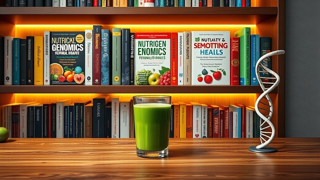 If you’re looking to transform your approach to health through personalized nutrition, I recommend exploring top nutrigenomics books that blend science with practical strategies. Titles like “Feel Good Nutrigenomics,” “Forever Young,” and “Nutrigenomics: Biohacking for a Better You” focus on tailoring diets based on your genetic makeup. Others, such as “The Complete Anti-Inflammatory Diet” and “Never Binge Again,” offer actionable advice for improving well-being and habits. Keep exploring to discover how these insights can empower your health journey.