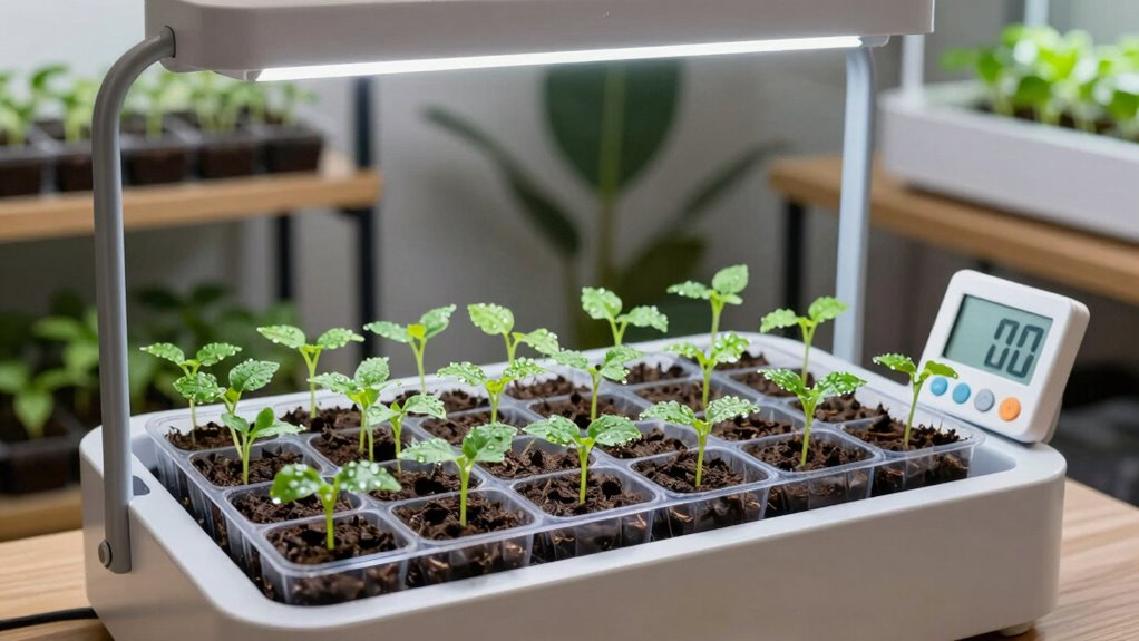 Temperature and humidity also play a key role in your germination station’s success, but with the right setup, you can easily manage these factors. Using a seed-starting tray with a clear cover can help retain moisture and maintain humidity levels, creating a mini-greenhouse effect. This environment, combined with controlled lighting, ensures your seeds germinate consistently and grow uniformly. As your seedlings develop, monitor their nutrition and light exposure closely, adjusting as necessary to prevent issues like damping-off disease or etiolation, which occurs when seedlings stretch in search of light. Additionally, maintaining proper environmental conditions is essential for consistent germination rates. Ensuring stable temperature control within your germination station can also significantly improve success, especially in fluctuating outdoor climates. Incorporating proper ventilation can help prevent excess humidity and reduce the risk of mold or disease. Furthermore, selecting the right seed-starting mix can enhance germination success and provide a balanced foundation for young plants.