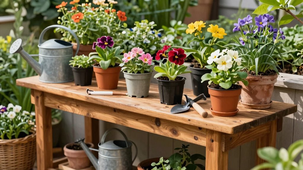 You might think upgrading your potting bench costs a fortune, but affordable options abound. Adding garden décor like colorful paint or decorative hooks can instantly refresh its look. Incorporate DIY watering stations using repurposed containers or cheap watering cans to boost functionality. These small upgrades prove that a little creativity and budget-friendly choices can transform your potting space, making it more efficient and visually appealing without breaking the bank.