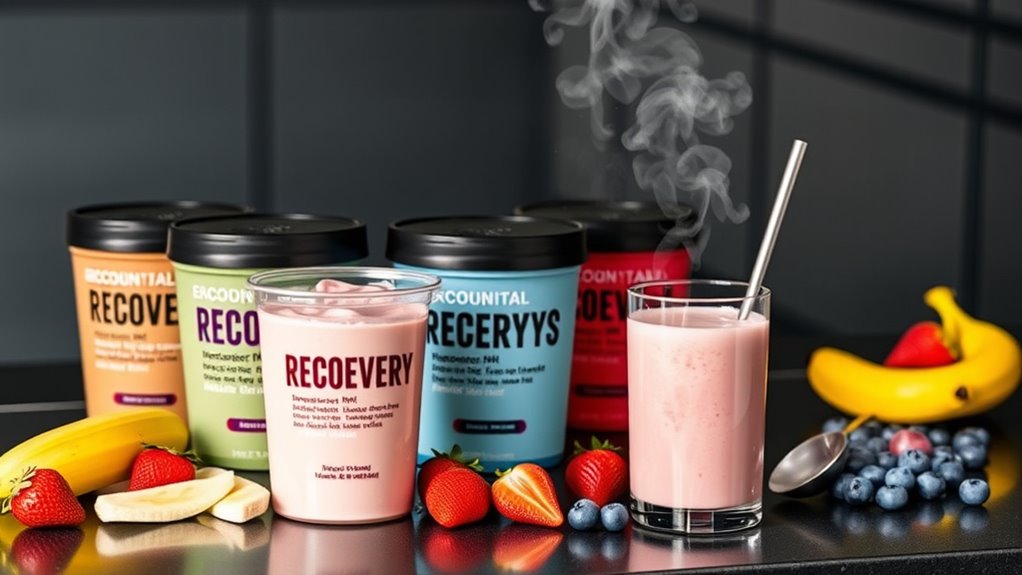 Choosing a recovery drink mix with the right nutritional balance is crucial for ideal recovery. A good mix typically features a 4:1 carbohydrate to protein ratio, which helps replenish glycogen stores and supports muscle repair. It’s also important to guarantee adequate electrolytes like sodium, potassium, and magnesium to restore mineral balance lost through sweat and maintain hydration. Using complete protein sources such as whey, casein, or plant-based proteins guarantees all essential amino acids are present for effective muscle recovery. Including supplements like glutamine and BCAAs can further enhance muscle repair, reduce soreness, and boost immune function. Ultimately, the nutritional content should match the workout’s intensity and duration, providing enough calories, macronutrients, and micronutrients to optimize your recovery process.