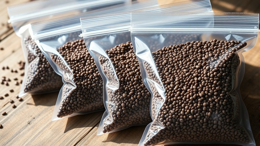 If you want your chia seeds to stay fresh and flavorful, I recommend exploring resealable bags made from durable materials like kraft paper or multilayer plastics with waterproof coatings. Options with clear windows, stand-up features, and airtight zipper closures are especially convenient. These bags not only keep moisture out but are also reusable and perfect for small quantities. Keep going, and you’ll find the best choices to keep your seeds fresh longer.