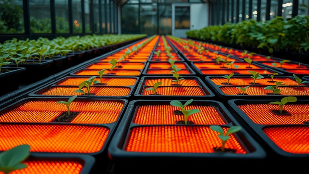 Ensuring precise temperature control in seed starter heat mats is vital for achieving ideal germination and healthy seedlings. Maintaining soil temperatures between 70°F and 85°F helps seeds sprout efficiently and develop strong roots. Digital thermostats or controllers with adjustable settings make it easy to fine-tune the temperature, preventing overheating or underheating. Some mats feature buffering zones that support gradual temperature changes, creating a stable environment for sensitive seeds. Real-time temperature sensors and dual digital displays enhance accuracy and simplify monitoring. Consistent temperature regulation directly boosts germination rates and promotes vigorous seedling growth. When choosing a heat mat, look for these features to guarantee your seeds receive reliable, precise warmth throughout the germination process.