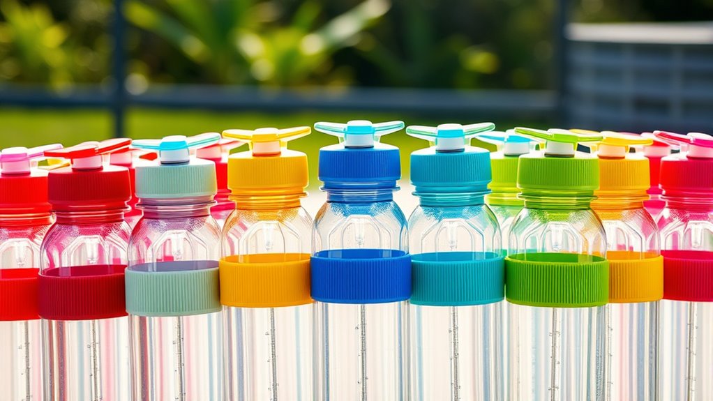 When I look for a sport squeeze bottle, I pay close attention to its leak-proof features because nothing ruins a workout more than unexpected spills. I prioritize bottles with specialized seals and gaskets that prevent water from escaping during vigorous activity or accidental drops. High-quality bottles often have self-sealing or one-way valves, allowing water to flow out when squeezed but blocking leaks when not in use. The design of the lid or cap is also vital—screw-on lids or flip-top caps with secure locking mechanisms provide extra assurance. Materials like BPA-free plastics with tight-fitting lids and reinforced seams further guarantee the bottle stays leak-proof, even after repeated use. These features give me confidence that my hydration stays contained, no matter how active I get.