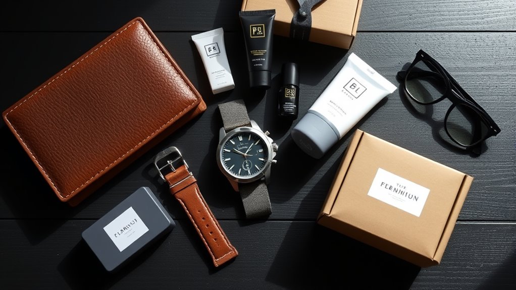 Selecting a subscription box that aligns with a man’s personal interests guarantees he stays engaged and excited with each delivery. To do this, consider his hobbies—whether he’s into fitness, outdoor adventures, or gourmet snacks—and find a box that supports these passions. Look for options that offer variety or customizable choices, guaranteeing the contents match his specific tastes. For example, fishing gear for anglers or health foods for fitness buffs can make the experience more meaningful. Also, check if the themes and items reflect his personal style—rugged, sophisticated, or playful—so he feels a genuine connection. Ultimately, ensure the subscription provides ongoing value and novelty, keeping him eager for each new box rather than feeling like it’s just a routine delivery.