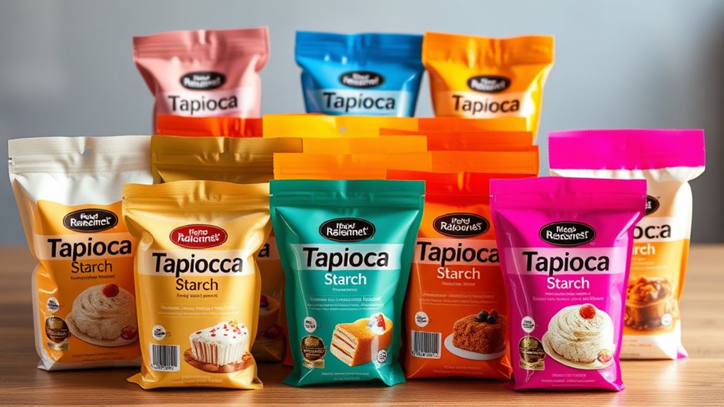 Selecting the right packaging for tapioca starch is essential for maintaining its freshness and quality. Resealable bags and jars are great for preventing moisture and contamination, keeping the starch fresh over time. If you bake frequently or need large quantities, bulk containers are cost-effective, although they require more storage space. For occasional use or smaller kitchens, smaller, portable packages are convenient and easy to handle. The packaging choice impacts shelf life, ease of use, and overall product preservation. When shopping, consider how often you’ll use the starch and your storage options. Proper packaging helps guarantee your tapioca starch remains free-flowing, pure, and effective for all your cooking and baking needs. Ultimately, the right packaging matches your usage habits and kitchen setup.