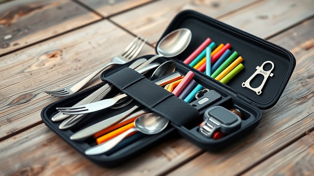 No matter which travel utensil kit you choose, remember that a stitch in time saves nine—being prepared makes all the difference. A compact, durable set guarantees you’ll never be caught off guard during your adventures. So, pick one that suits your needs, pack it wisely, and enjoy hassle-free eating on the go. After all, the little things, like your utensils, can make your journey smoother and more enjoyable.