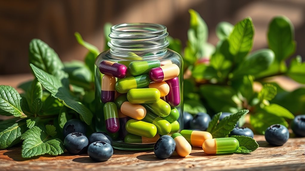 When selecting vegan probiotic capsules, it’s essential to take into account the delivery and survival technology they employ. These technologies ensure that the probiotics survive stomach acid and reach the intestines intact, where they can be most effective. Look for capsules with delayed-release or acid-resistant coatings, as they help protect the strains during digestion. Advanced options like enteric coatings or specialized capsule materials further enhance survival rates. Spore-forming bacteria, often soil-based, are naturally resilient and more likely to survive the journey through your digestive tract. Shelf-stable formulations, such as freeze-dried microorganisms, also maintain potency without refrigeration. Choosing probiotics with proven delivery methods considerably boosts the chances of successful colonization and long-term gut health benefits.
