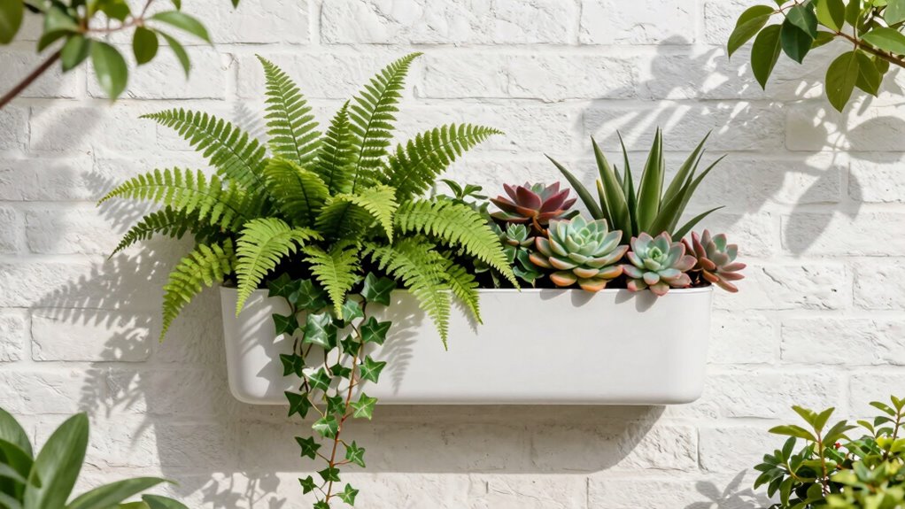 To keep soil moist in vertical planters, you’ve got to stay ahead of the game. Use an efficient irrigation system—drip emitters or self-watering features—that guarantees consistent moisture. Don’t forget moisture retention techniques like adding organic mulch or water-retaining gels. Regularly check the soil’s dampness, especially during hot spells. With these strategies, your plants thrive, and you avoid the stress of dry soil, keeping your vertical garden lush and vibrant.