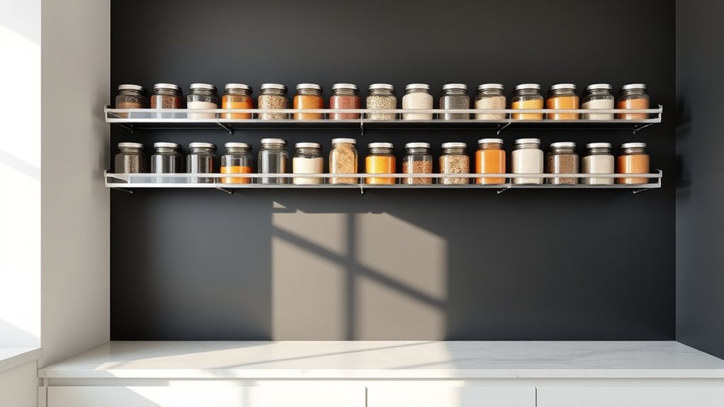 To prevent jars from falling off wall-mounted racks, I recommend using racks with secure, deep grooves or lips that grip the jars firmly. Always make certain your jars have lids or caps that fit tightly. Additionally, avoid overcrowding the rack, which can cause instability. I also double-check the wall anchors and screws are sturdy, especially if you’re storing heavier jars, and periodically tighten them to keep everything secure.