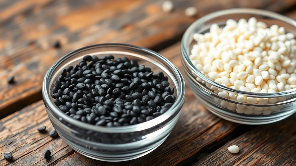 When choosing between black and white chia seeds, understanding their subtle differences can help you make the best choice for your needs. While they look different, these seeds are remarkably similar in many respects, especially when it comes to their nutritional differences and culinary uses. Both varieties are packed with fiber, omega-3 fatty acids, protein, and essential minerals like calcium and magnesium. However, some slight variations may influence your decision depending on your dietary goals or taste preferences. For example, some studies suggest that black chia seeds contain marginally higher levels of anthocyanins, which are powerful antioxidants responsible for their darker hue. These antioxidants can contribute to overall health, but the difference isn’t dramatic enough to make one superior to the other in nutritional value. Instead, both types serve as excellent sources of plant-based nutrition, making them versatile additions to your diet. Additionally, the antioxidant content may vary slightly, which could be a consideration for those seeking maximum health benefits.