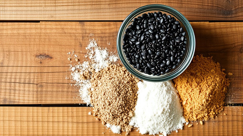 When baking gluten-free, combining chia seeds with other gluten-free flours can boost both nutrition and texture. Chia seeds are a powerhouse of nutritional benefits, packed with omega-3 fatty acids, fiber, protein, and antioxidants. By integrating them into your baking, you not only enhance the overall health profile of your treats but also improve their structure. The gelatinous quality of chia when soaked creates a natural binder that can replace eggs, making your baked goods more cohesive and moist. This sticky property markedly contributes to texture enhancement, especially in recipes that otherwise might turn out crumbly or dry. Incorporating chia seeds can also help balance humidity levels, ensuring your baked goods stay fresh longer. Using chia seeds alongside flours like almond, coconut, or rice flour allows you to tailor the texture to your liking. For instance, when combined with almond flour, chia can add a slight crunch that balances well with the nutty flavor. In recipes with coconut flour, chia helps mitigate the dry, dense feeling that coconut alone can produce by adding moisture and a bit of chewiness. Rice flour, which tends to produce a light and airy crumb, benefits from chia’s ability to improve cohesion, giving baked goods a more satisfying bite. So, whether you’re making muffins, bread, or pancakes, adding chia seeds can lead to a more pleasing, well-rounded texture. Beyond texture, chia seeds also boost the nutritional profile of your baked goods without altering the flavor too much. They’re a simple way to incorporate extra fiber, which aids digestion and promotes fullness. The healthy fats from chia contribute to heart health, while the protein content supports muscle repair and overall energy levels. When you bake with chia, you’re creating a more nourishing treat that supports your dietary goals while still satisfying your sweet tooth. This makes them especially valuable if you’re following a gluten-free or plant-based diet, where nutrient density can sometimes be limited. Incorporating chia seeds into your gluten-free baking routine is straightforward. You can add whole seeds directly or soak them in water beforehand to create a gel that acts as an egg replacer. This not only helps with binding but also ensures even distribution throughout your batter. Experimenting with different ratios of chia to flour allows you to find the perfect balance of nutrition and texture for your recipes. Additionally, selecting the right gluten-free flours can influence the overall outcome, making chia a versatile addition. Overall, combining chia seeds with other gluten-free flours is an easy, effective way to elevate your baked goods, making them healthier, more satisfying, and better in texture.
