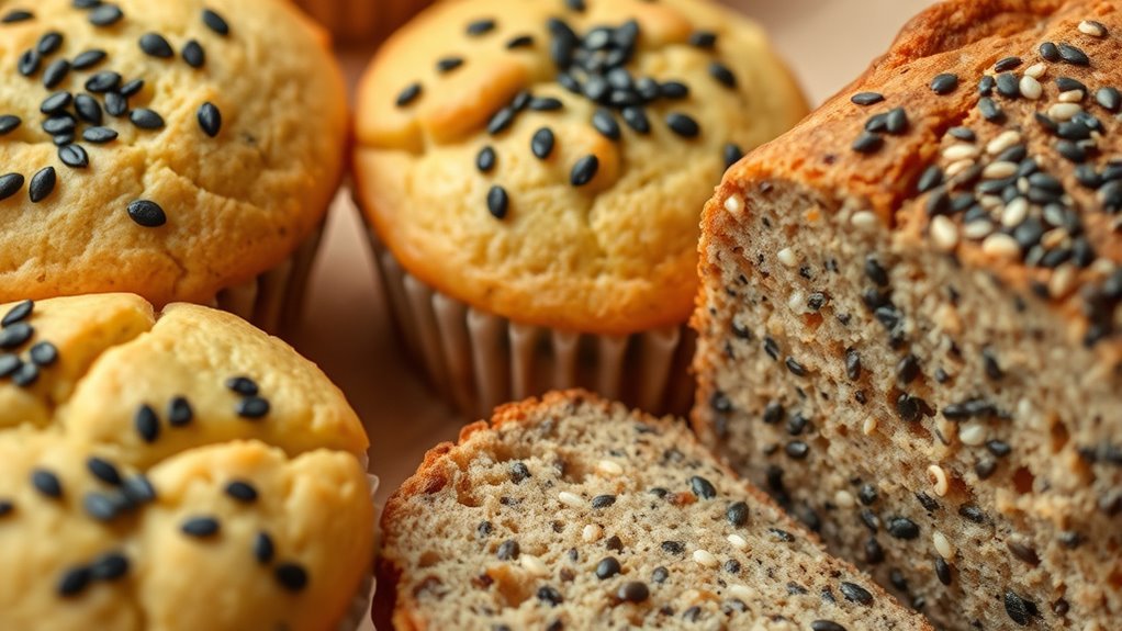 Adding chia seeds to your baked goods like bread, muffins, and cookies boosts their nutrition, texture, and visual appeal effortlessly. You can mix whole or ground seeds into the batter or create a gel by soaking them in water to replace eggs or add moisture. Their neutral flavor means they blend seamlessly without altering taste. Plus, they introduce a pleasant crunch and speckled look. Keep exploring to discover more tips for incorporating chia seeds into your recipes.