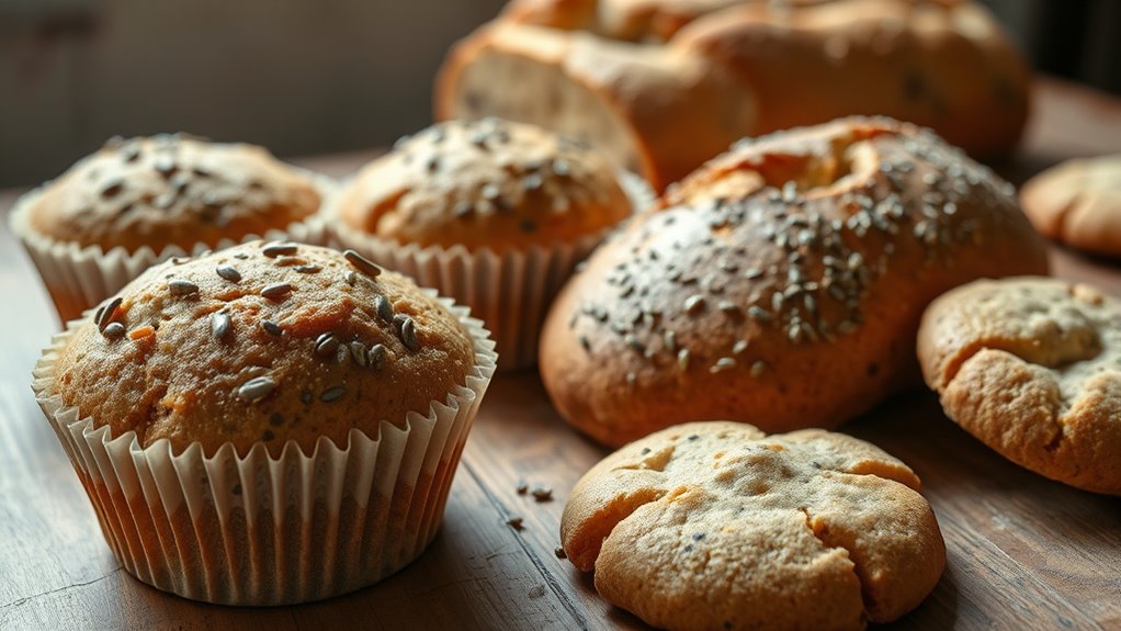 Baking with chia seeds is easy and boosts your treats’ nutrition, texture, and crunch. You can add dry or soaked seeds to muffins, bread, and cookies for extra fiber, omega-3s, and moisture retention. Soaking seeds creates a gel that enhances texture and shelf life, while sprinkling or mixing them in adds a delightful crunch. Keep exploring how these versatile seeds can elevate your baked goods even further—you’ll discover simple tips for yummy results.