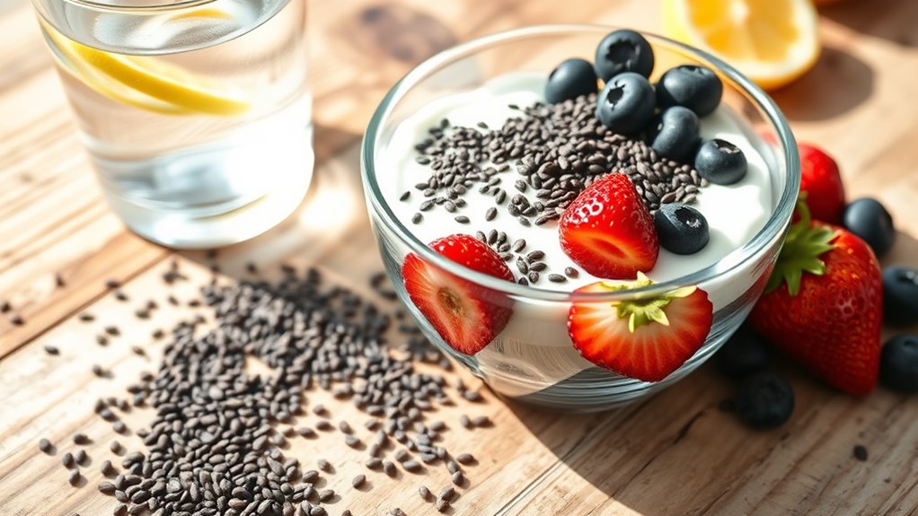 Meal prep becomes more efficient when you incorporate chia seeds because they’re easy to store and add to a variety of dishes. You can prepare a batch of chia pudding at the beginning of the week, which can be quickly customized with fresh fruits or nuts for different flavors. Adding chia seeds to your smoothies not only boosts their nutritional value but also thickens the texture, making them more satisfying. If you’re into baking, mixing chia seeds into muffins or bread dough adds extra fiber and nutrients without markedly changing the flavor or texture. This makes it easier to stick to your healthy eating plan because you don’t have to think twice about adding them—just toss them in and enjoy the benefits. Additionally, because the soluble fiber in chia seeds forms a gel-like substance when soaked, it can aid in hydration and support your overall digestive health.
