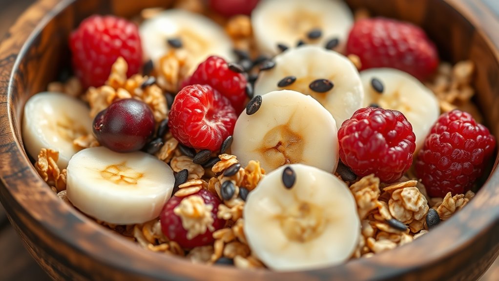 Adding chia seeds to your breakfast cereals and granola is an easy way to boost their nutrition. Just sprinkle a tablespoon directly onto your cereal or mix them into homemade granola for extra omega-3s, fiber, and minerals. You can also soak seeds overnight in milk or yogurt to make chia pudding or blend them into smoothies. Keep exploring different ways to incorporate chia seeds for even more health benefits and delicious variety.