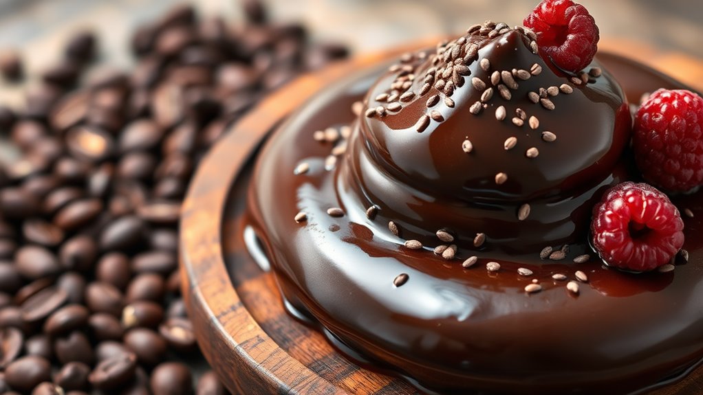 You can easily boost the nutrition of your chocolate desserts by adding chia seeds, which provide fiber, omega-3s, and antioxidants. Try making chocolate chia pudding, blending avocado, cocoa, and chia seeds for a creamy mousse, or shaping energy bites with cocoa, oats, and nuts. These recipes deliver indulgent flavors while supporting your health. Keep exploring for more delicious ways to enjoy chocolate and chia together in nutritious treats.