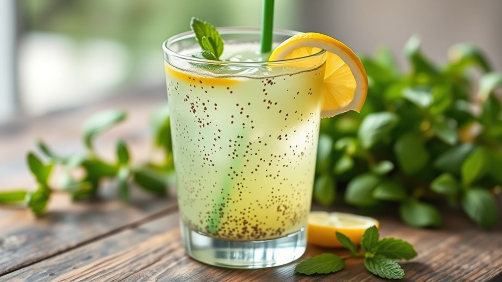 Beyond their fiber benefits, chia seeds offer significant hydration advantages. When you add them to a drink, they absorb liquid and swell, creating a hydrating gel that delivers moisture directly to your cells. This process helps maintain electrolyte balance and supports *ideal* bodily functions, especially when you’re aiming to flush out toxins. The hydration benefits extend further because chia seeds can hold up to 10-12 times their weight in water, making your detox drink more effective at keeping you hydrated throughout the day. Proper hydration is *vital* during detoxification because it helps your kidneys and liver work more efficiently to eliminate waste. Drinking a chia seed-infused beverage ensures you stay hydrated, reduces feelings of fatigue, and can even curb hunger, which is helpful if you’re trying to cut back on processed foods or sugars.