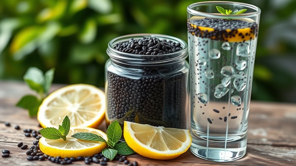 Detox diet myths often promise quick fixes, but chia seeds aren’t magic bullets. They support your body’s natural detoxification by providing fiber, omega-3s, and antioxidants that promote healthy digestion and waste elimination. However, they don’t directly remove toxins. Chia seeds fit into a balanced approach to health, complementing proper hydration and a nutritious diet. If you want to uncover how these superfoods truly support your body’s natural cleaning process, keep exploring the facts.