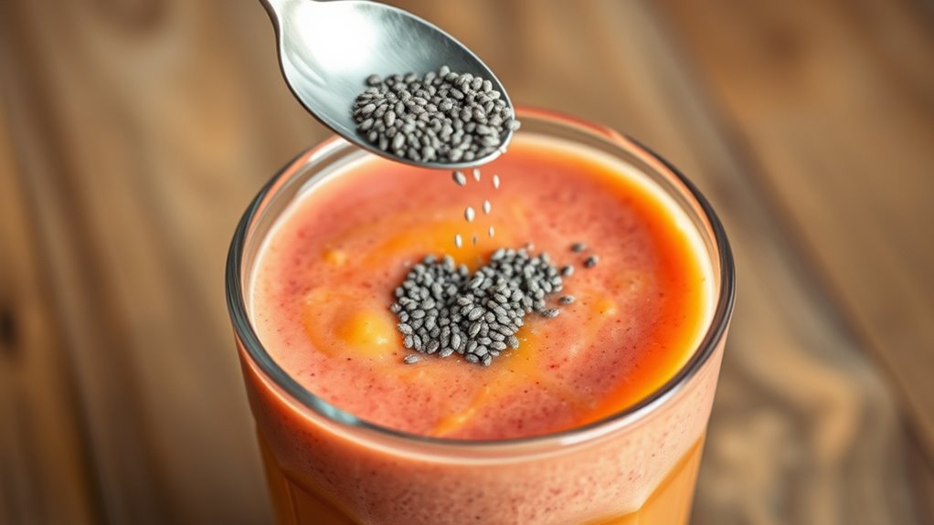 To avoid clumps when mixing chia seeds into drinks, start by pre-soaking them in water or juice for 10-15 minutes to create a gel-like texture. Always add seeds gradually while stirring vigorously, ensuring they’re evenly coated. Use a blender or shaker bottle for better distribution and stir or shake frequently during the process. Keep seeds in motion to prevent sticking, and continue exploring tips that help you achieve smooth, clump-free drinks.