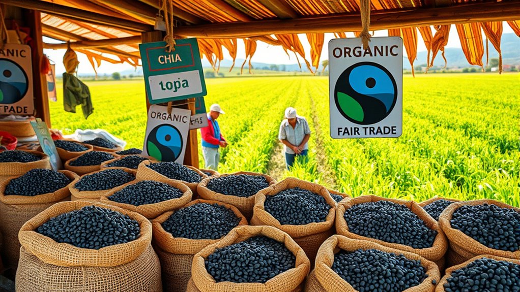 Fair-Trade and organic certifications boost chia prices by signaling ethical sourcing and ensuring high quality. These labels build your trust, justify higher costs, and help producers access premium markets. Certified chia often commands a price premium, supporting sustainable farming and better wages for farmers. If you keep exploring, you’ll discover how these certifications influence consumer choices and market dynamics, shaping a more ethical and transparent chia industry.