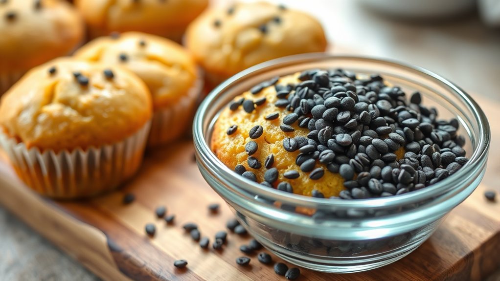 With each spoonful of chia seeds, you transform your gluten-free treats into moist, tender delights. Imagine the tiny seeds weaving a web of elasticity and moisture, turning dense dough into fluffy perfection. As you bake, the chia’s gel-like magic creates a crumb that’s light and satisfying. Embrace these humble seeds, and watch your baked goods come alive with a texture that invites every bite, making your gluten-free baking truly irresistible.
