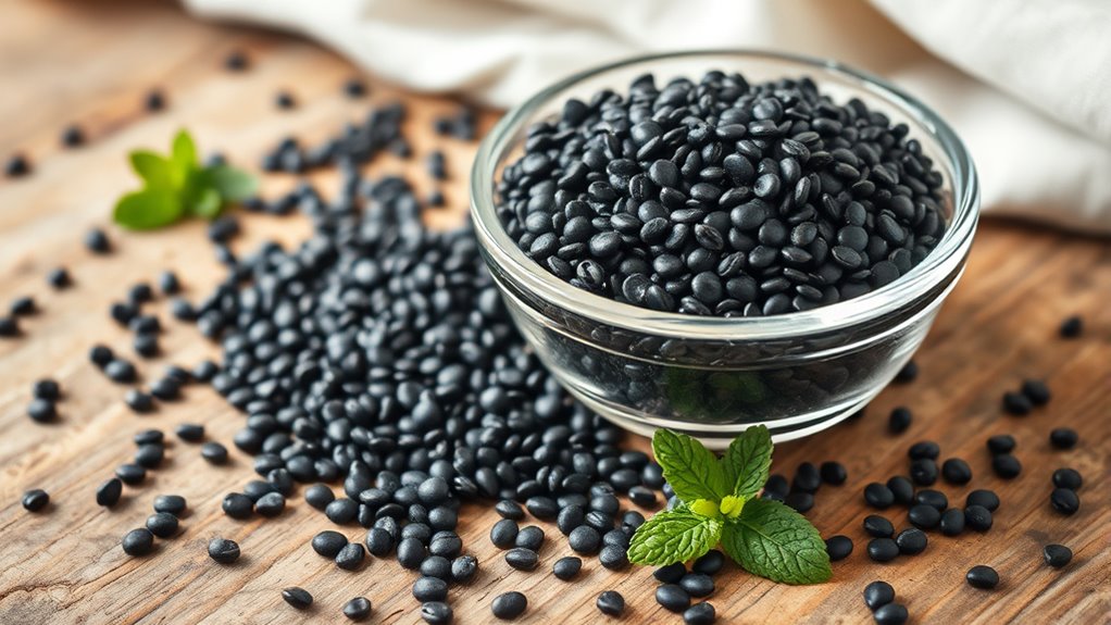 FODMAPs are fermented sugars in certain foods that can cause gas, bloating, and discomfort, especially if your gut microbiota isn’t balanced. Chia seeds are considered low-FODMAP because they contain minimal fermentable carbs, producing less gas during digestion. Their high fiber content supports beneficial bacteria and promotes a healthy gut, reducing bloating. Keep exploring to discover how chia seeds can fit into a gut-friendly diet and help manage your symptoms effectively.
