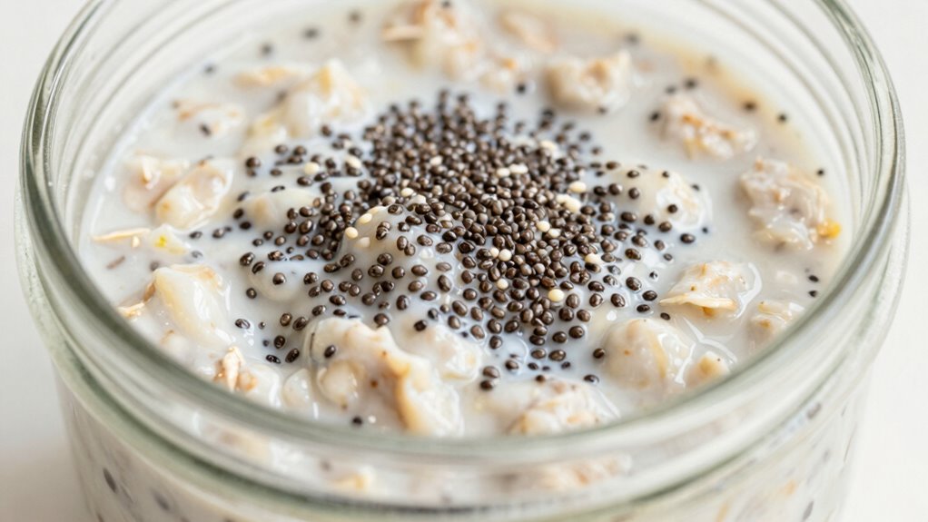 Like the alchemist turning base metals into gold, you can transform your overnight recipes by replacing traditional thickeners with chia seeds. They serve as a fantastic alternative, providing natural thickening while adding nutritional benefits like omega-3s and fiber. Chia seeds absorb liquid and create a gel-like texture, making them a versatile choice. Plus, you get the added bonus of healthy nutrients, making your dish both delicious and nourishing.