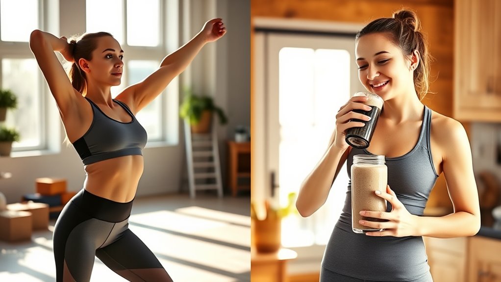 Eating chia before your workout helps provide sustained energy, hydration, and prevents blood sugar spikes, making it ideal for endurance and weight loss. Consuming it 30-60 minutes prior guarantees your body absorbs nutrients effectively during exercise. Post-workout chia enhances recovery, replenishes glycogen, and reduces inflammation, supporting your weight loss goals. To optimize results, timing matters—continue exploring how to make strategic choices that best fit your routine and fitness ambitions.