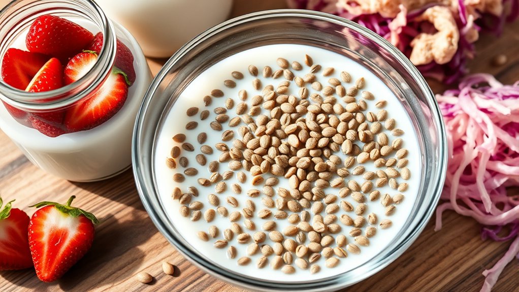 Combining chia seeds with probiotic foods is a smart way to boost your digestive health. The fiber in chia acts as a prebiotic, feeding beneficial bacteria in your gut, while probiotics introduce live good bacteria directly. This pairing reinforces your microbiome, aiding digestion and nutrient absorption. Plus, chia seeds’ gel-forming properties can soothe inflamed gut lining. Keep exploring to discover simple ways to incorporate this powerful combo into your daily routine.