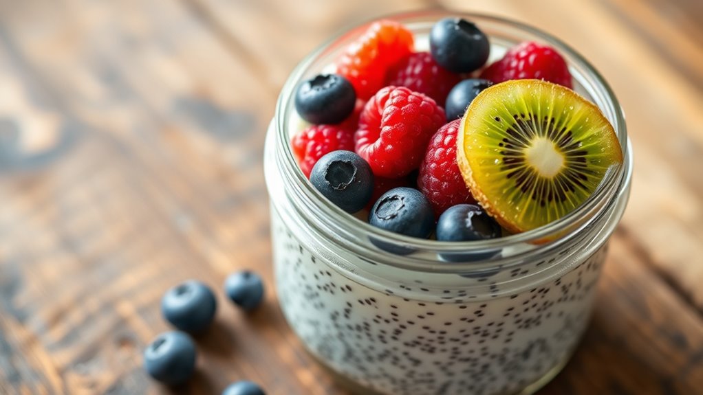 To add variety to your chia pudding, try mixing different fruit combinations like berries with banana or mango with pineapple. You can also explore nut options such as almonds, walnuts, or pecans for crunch and healthy fats. These toppings not only enhance flavor but also boost nutrition. Feel free to experiment with spices like cinnamon or a drizzle of honey to keep your chia pudding exciting and satisfying every time.