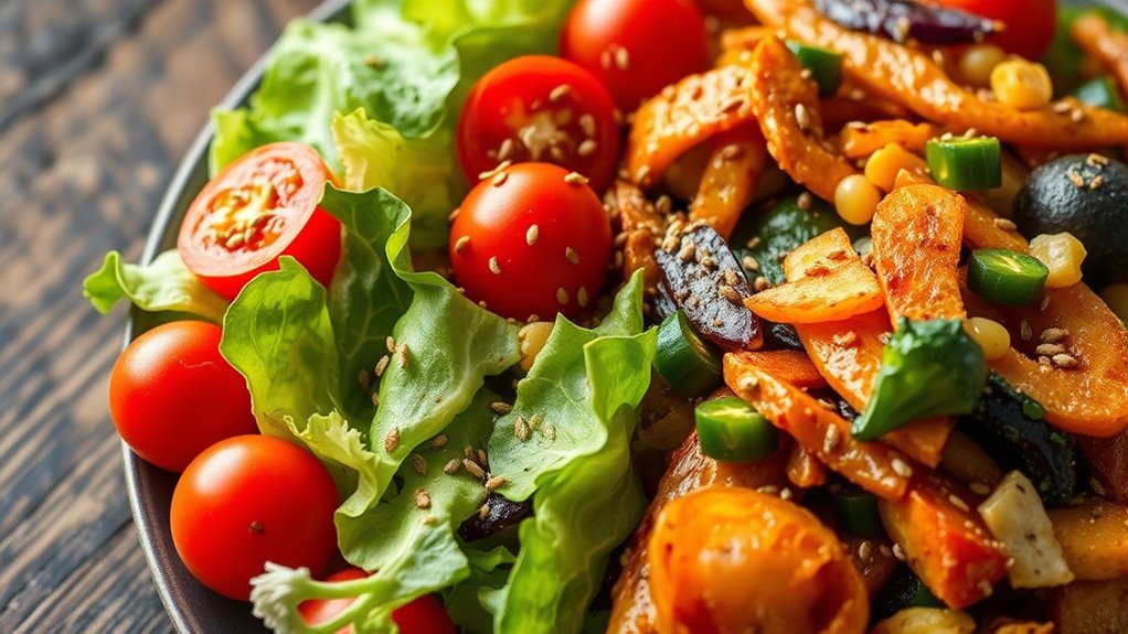 Chia seeds add a unique texture to your stir-fry by offering slight crunch and gel-like consistency as they absorb moisture. They enhance texture and promote flavor integration by blending seamlessly into the dish. You’ll notice a subtle, nutty flavor that complements vegetables and proteins, giving your stir-fry a richer, more satisfying mouthfeel. Just sprinkle them in near the end to maximize their beneficial texture enhancement without overpowering the dish.